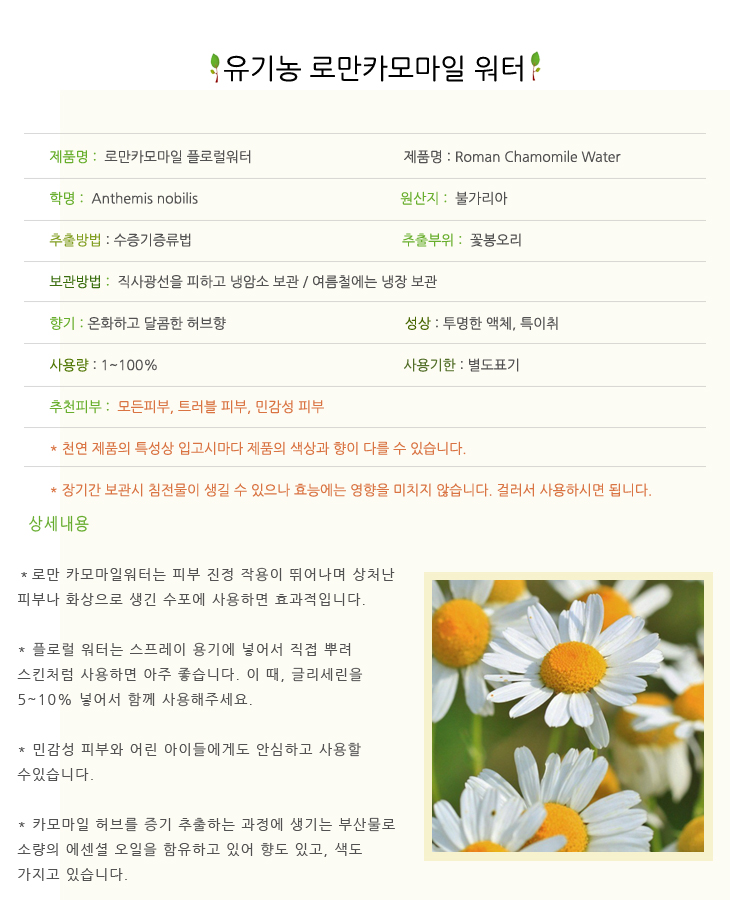 유기농 로만카모마일 워터 100ml 캐모마일꽃수 Anthemis Nobilis Flower Water