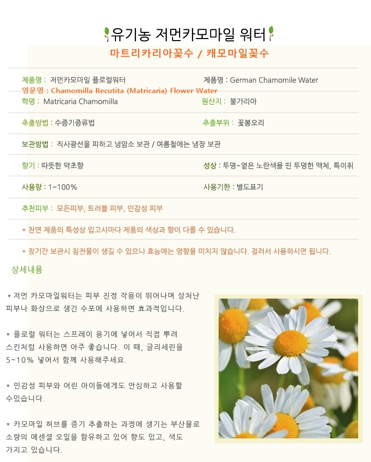유기농 저먼카모마일워터 500ml 마트리카리아꽃수 캐모마일꽃수 Matricaria Chamomilla recutita