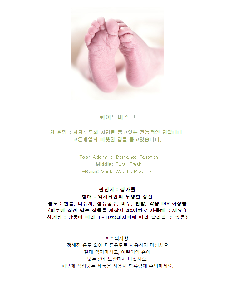 | 주의사항 | * 정해진 용도 외에 다른 용도로 사용하지 마십시오. * 절대 먹지 마시고, 어린이의 손이 닿지 않는 곳에 보관하세요. * 제품 제작 시 첨가량에 주의하세요. |