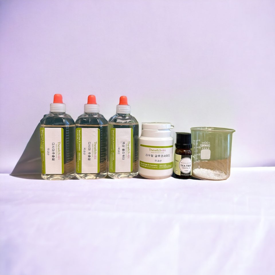 다시마추출물 200ml, 액상 폴리쿼터 100ml, 라우릴글루코사이드 100g, 티트리오일 5ml