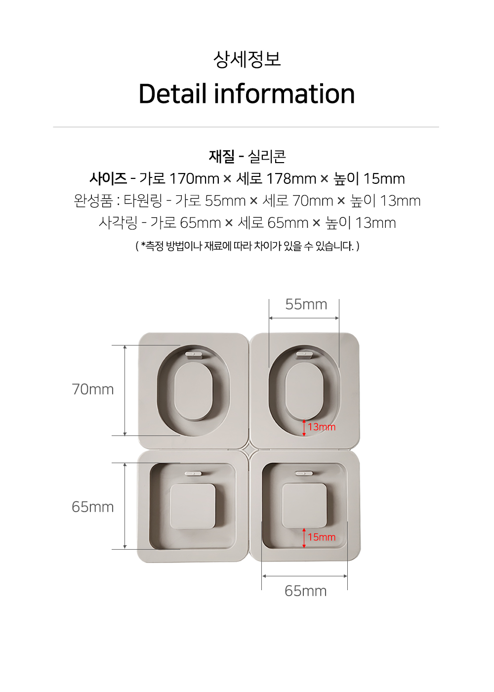 | 사이즈 | 몰드 전체 170mm×178mm×15mm 타원링 - 가로 55mm × 세로 70mm × 높이 13mm 사각링 - 가로 65mm × 세로 65mm × 높이 13mm |