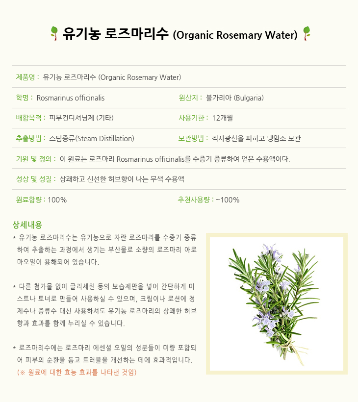 유기농 로즈마리워터 1L 로즈마리수 Rosmarinus Officinalis Rosemary Water